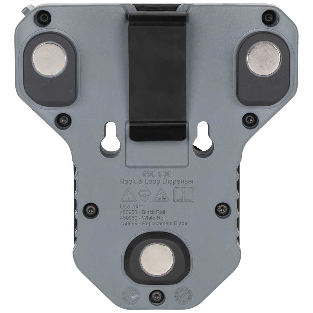 This time saving Hook & Loop Tape Dispenser takes the hassle out of cutting hook and loop tape to make custom length cable ties. Clip it to a belt, mount to a metal surface using the magnets or use the keyholes for screw mounting. Tape can be cut to any length with an easy, one-handed cutting action using the integrated cutter. Strong, yet flexible hook & loop tape securely holds and manages wire and cable bundles of any size.