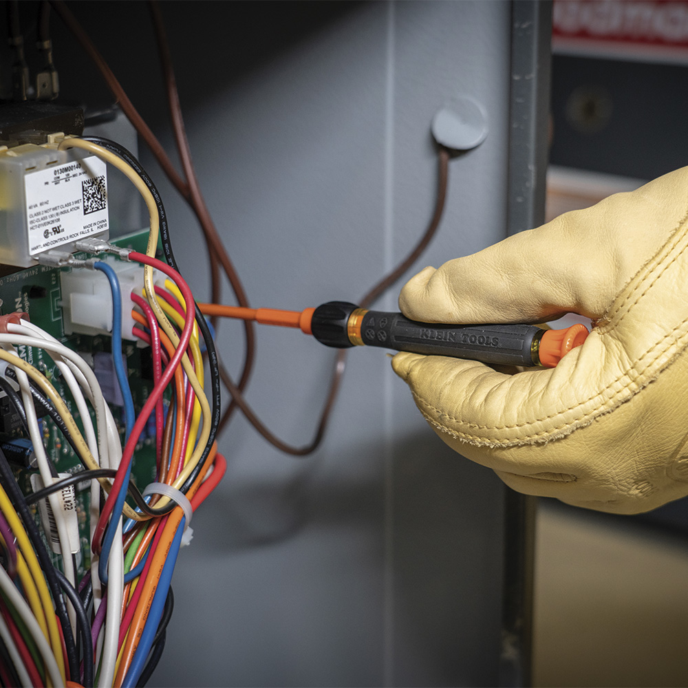 Klein Tools insulated electronics screwdrivers are designed for precision work, and feature a swivel cap for optimum control. Made of the highest quality tempered steel, carefully heat-treated for maximum strength, and precision machined for secure fitment in fasteners. The rotating caps and Klein's exclusive Cushion-Grip™ handles offer outstanding comfort and control. The insulated screwdriver has 1000V insulation that includes two tips on one blade that exceed the ANSI and ASTM standards