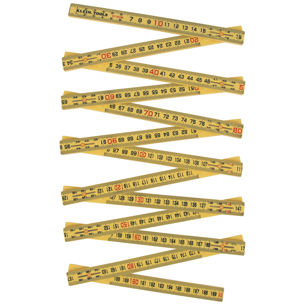 Klein Tools 2-Metre Fibreglass Folding Ruler is constructed of tough nylon, reinforced with glass fibres for added durability and resistance to weather, abrasion and most chemicals. Metric measurements are marked on both sides and both edges, graduated to 1 mm. Graduations are engraved on both sides.