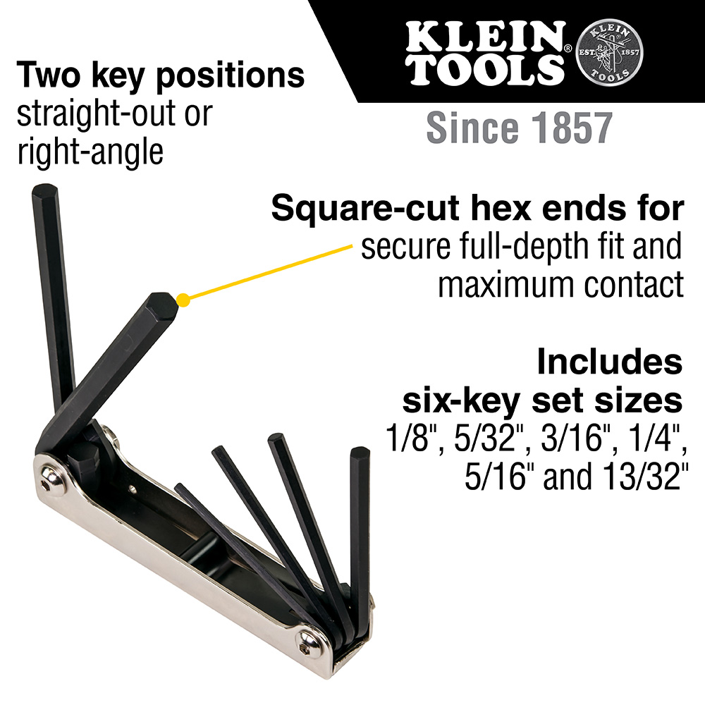 No need to worry about lost hex keys with the Klein Tools Folding Hex Key Set. This handy device features 6 different metric-sized hex keys in a convenient folding tool that fits easily into your pocket or tool box. The hex ends are square cut so that they fit securely into hex sockets.