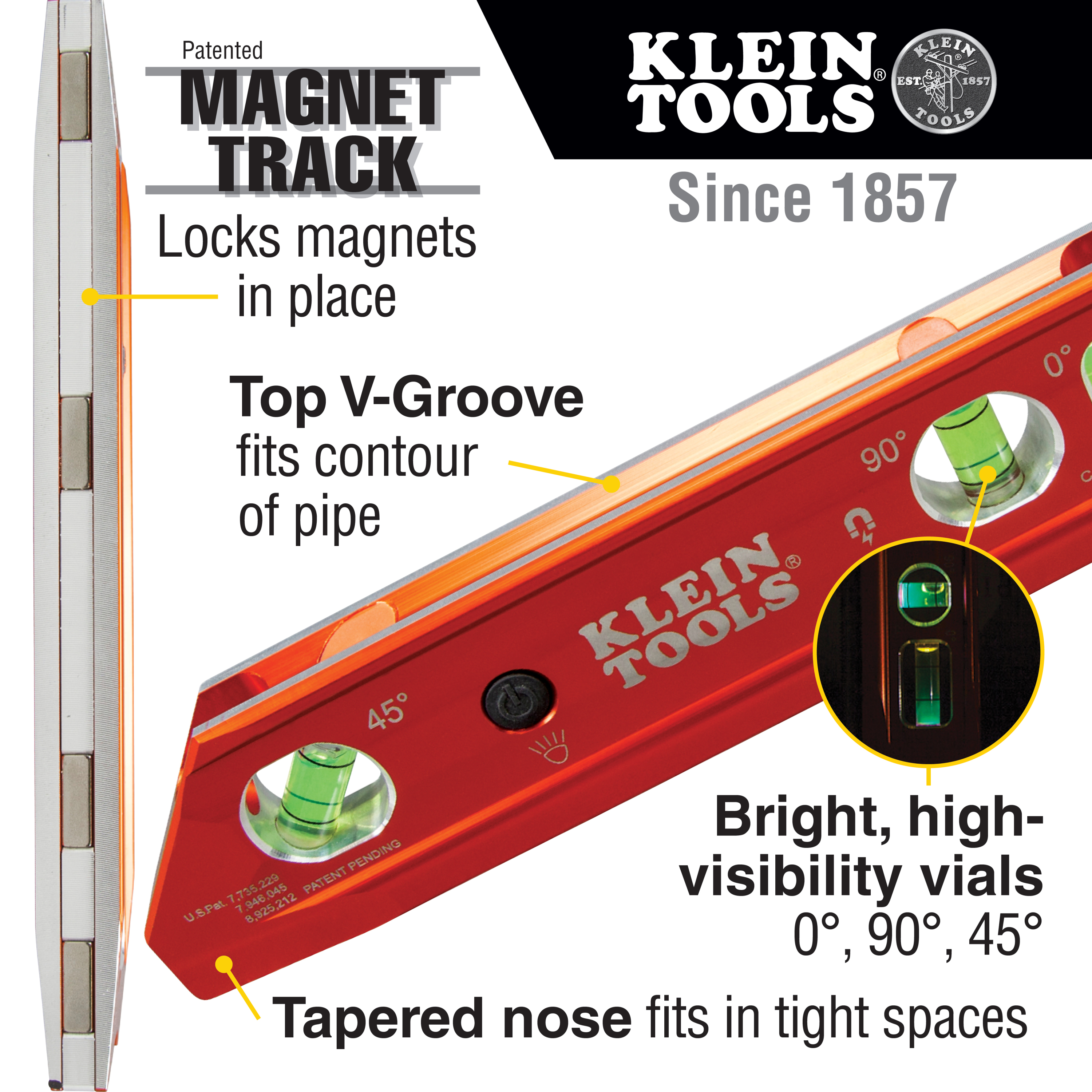 The Klein Tools 9-Inch Lighted Aluminium Billet level is designed for effective levelling on and off the construction site. The patented Magnet Track keeps the powerful rare earth magnets secure and ensures that they won't fall out. This leveller also includes large, easy-to-read vials and vial windows for easy viewing at any angle. The vials are also brightly illuminated by the LED lights to ensure easy reading in all light conditions. The V-groove fits snugly into pillars, posts, conduit, pipe and any other round surface. The tapered nose slides into pockets and corners. Whether you're a carpenter, electrician, plumber, drywall installer, DIY enthusiast or professional tradesperson, the Klein Tools Cat. No. 935RB can help make your levelling tasks easier.