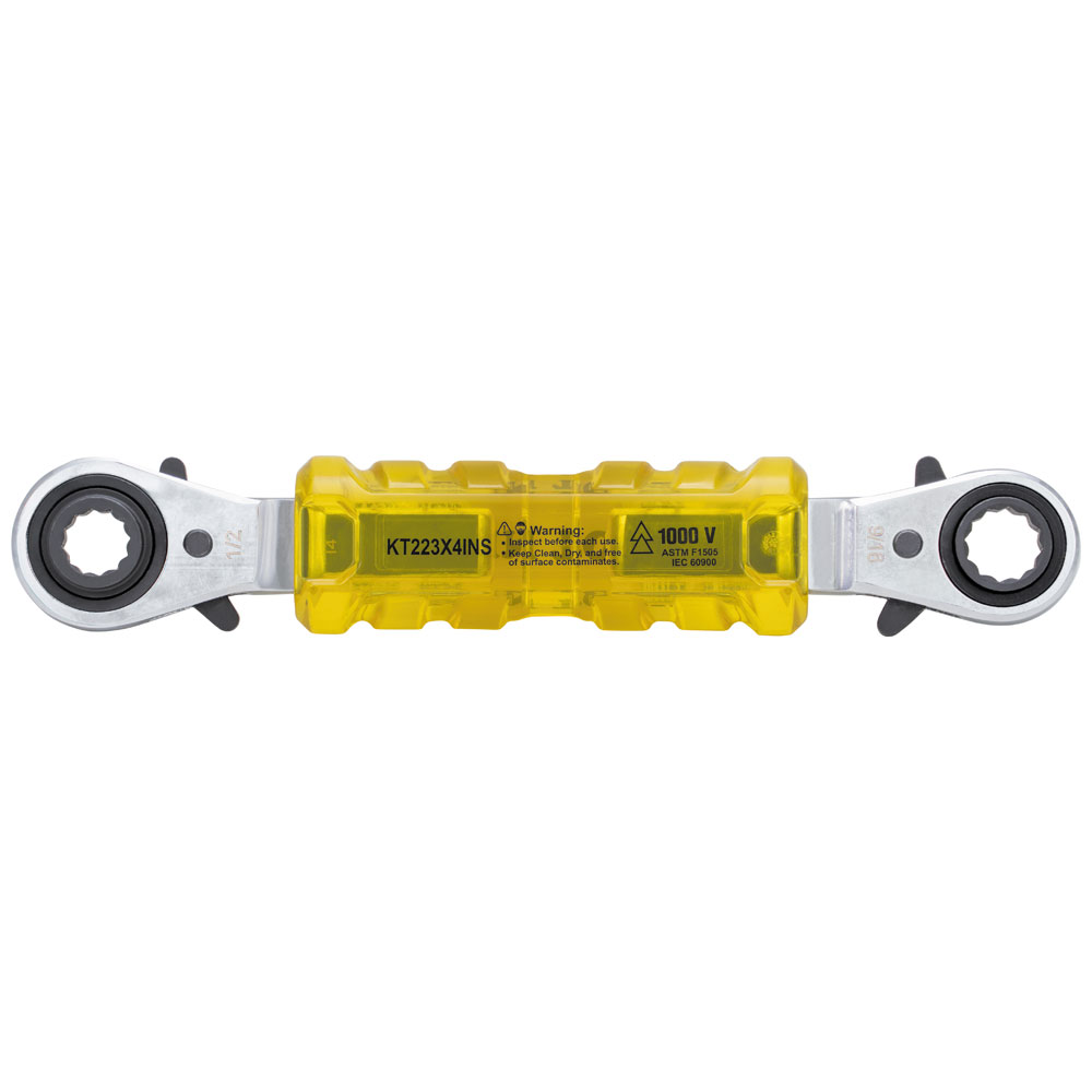 The Klein Tools Linesman's Insulating 4-in-1 Box Spanner is the only double-ended 4-in-1 spanner on the market to meet the ASTM standard 1,000 V rating. It features a transparent handle showing that the metal ends of the spanner are not touching. The solid, durable spanner features four 12-point socket sizes: 1/2'', 9/16'', 5/8'' and 3/4''.
