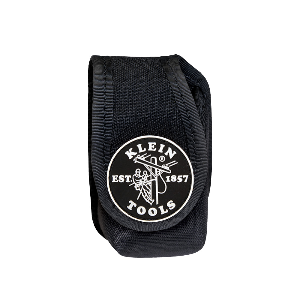 The Klein Tools PowerLine Extra-Small Mobile Phone Holder features Cordura nylon construction with a closed bottom, and a hook-and-loop flap closure for keeping the phone secure. The holder can be attached to a belt.