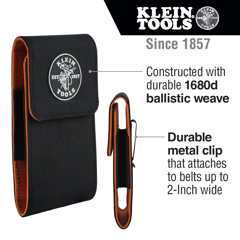 Keep your larger mobile phone safely stored away in the Klein Tools Tradesman Pro™ Phone Holder. Even mobile phones with a protective case will easily fit in the phone holder. Constructed with durable 1680d ballistic weave, it has a durable metal clip that attaches to belts up to 2'' wide. Designed to hold mobile phones with cases up to 7 x 3.75 x 0.75 inch.