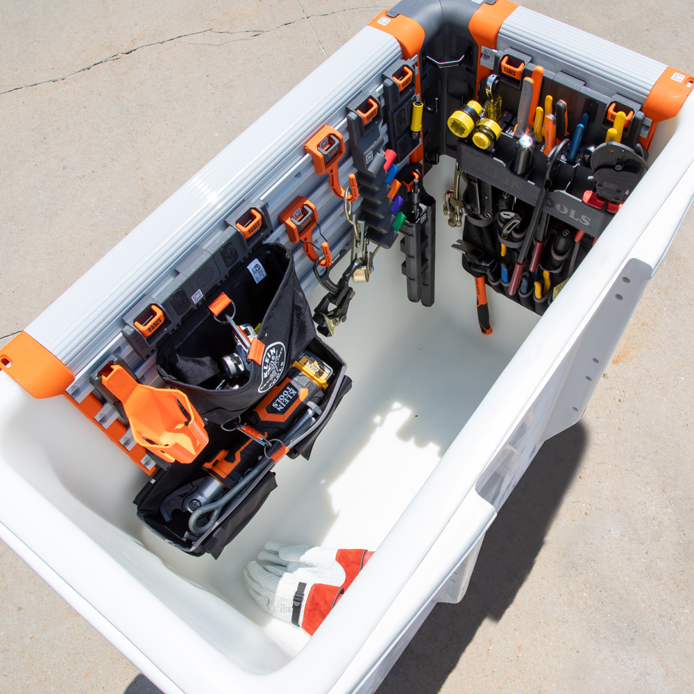 The Bucket Work Centre is an ecosystem that will revamp the way a Lineman works. It allows a Lineman to customise their workspace, just like other professionals customise their office space. This will be ''The Lineman's Office''. Made of impact resistant materials with dielectric properties to help stand up to the toughest work environments. Closed Hook Module designed with a closed latch to help secure blankets or tools and help prevent tools from falling.